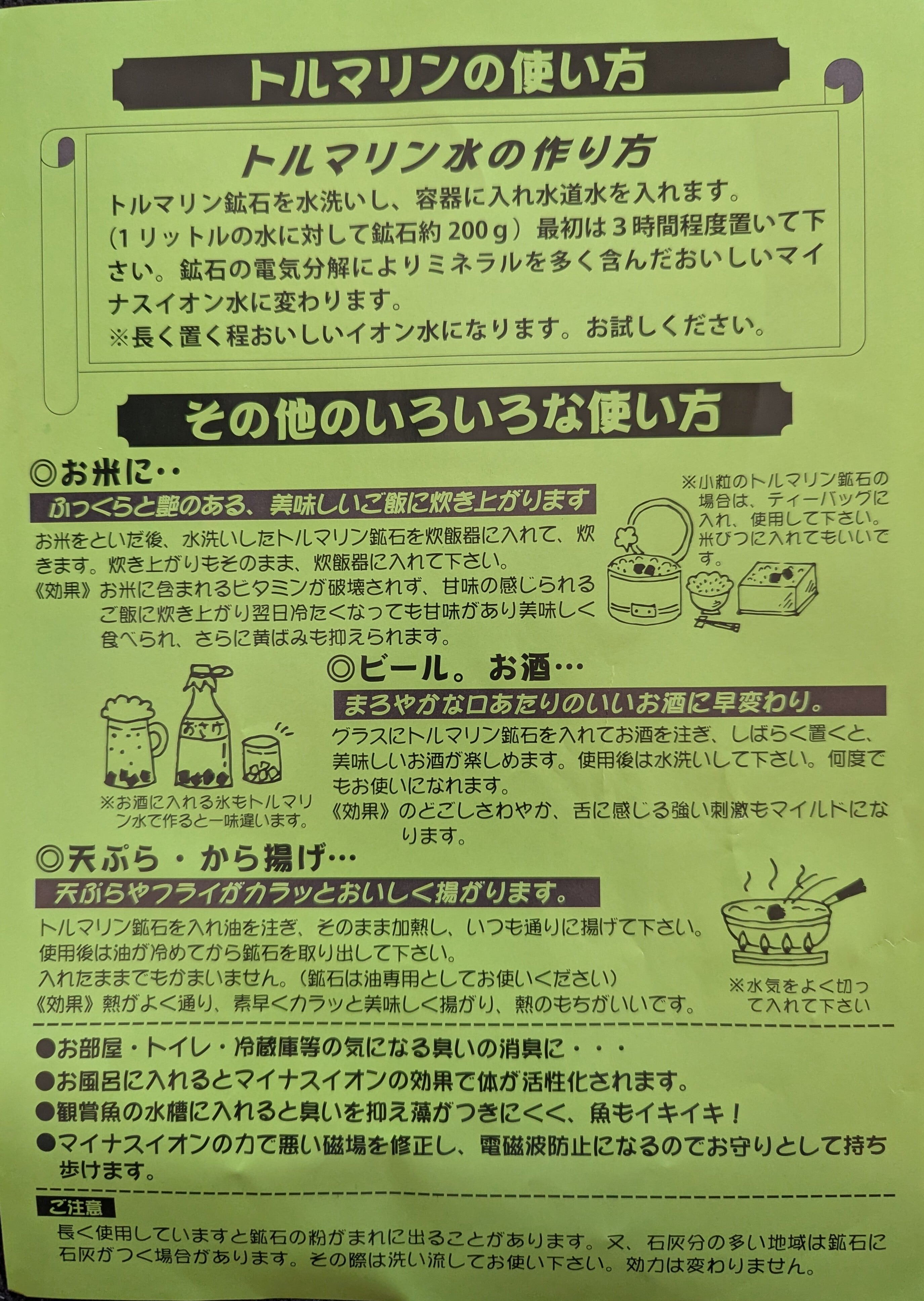 トルマリン鉱石の持つ微弱電流特性が水を活性化し、マイナスイオンを発生させます。マイナスイオンは界面活性(汚れを落とす)効果をもち、さらにトルマリン鉱石からは様々なミネラル分が溶け出します。